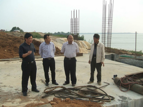 2012年4月,公司總經(jīng)理潘群芳(左二)陪同市水利局局長胡經(jīng)緯(右二)檢查小河嘴進(jìn)水閘工地